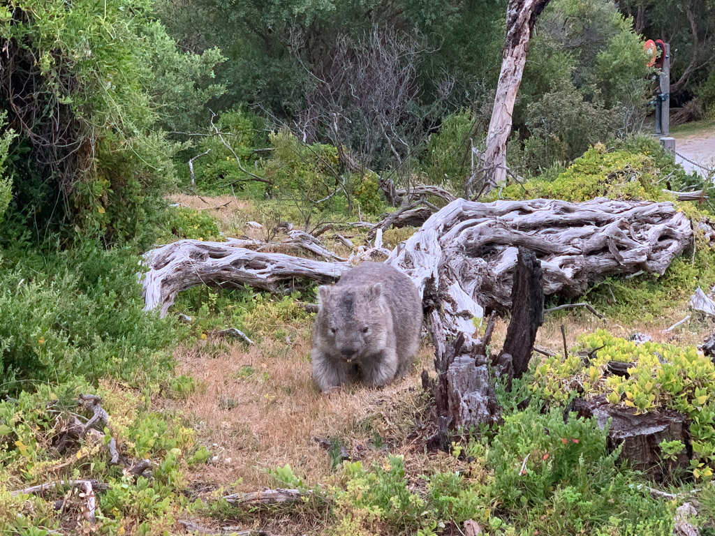 I was not prepared for the complete change in weather that waited for us at Wilson’s Promontory National Park. I thought I was. After all, I had seen the little swirls on the map meaning high winds and know that promontory means ‘point of land that juts out into a large body of water’. Naturally, that influences things. When I stepped out of the van that first time though, I truly expected it to snow.  It did rain off and on the whole time we were there but we still managed to get out wandering and within minutes of arriving to the campground spotted this adorable looking wombat.